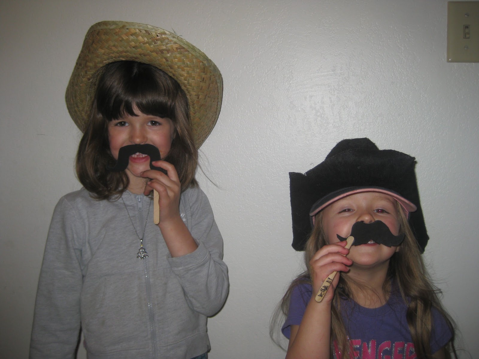 This weekend, we went to my niece's cowgirl birthday party, and we all posed with mustaches they had made in pictures. We brought some home with us and the girls have enjoyed playing with them... so I snapped some pics. Too cute!