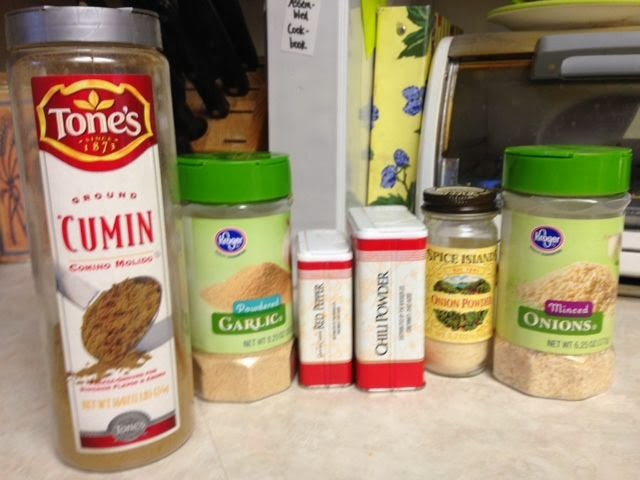 One of the recipes was for taco seasoning mix. It is very handy to make it in a larger amount and just use as needed. I usually just add a little bit of each ingredient to the browned ground beef, and it tastes great! The kids can tell when my hubby seasons the meat, he adds more seasonings than I do! :-D